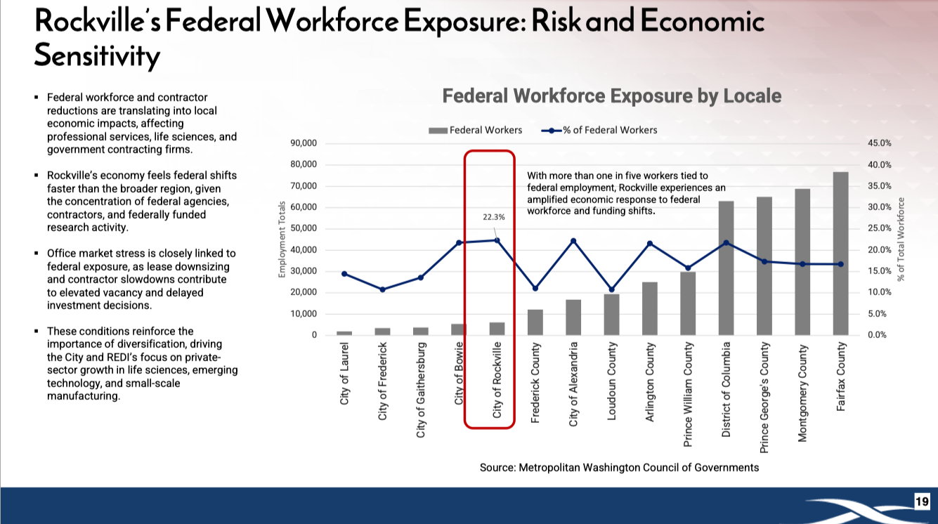 City officials reviewed a detailed economic report showing Rockville is highly exposed to federal employment and contracting. Roughly one-fifth of local workers depend on federal jobs or funding. Layoffs and reduced contracting increased unemployment and softened consumer spending. Office vacancies remain high as contractors shrink their footprints, while housing listings have risen across the region. The economy is not collapsing — but it is shifting away from federal-driven growth toward a more uncertain private-sector future. Note: This post is based on the reports provided by REDI in the Council agenda packet; in a future post I hope to share the City Council’s reaction.