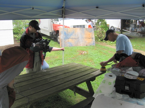 Lt. Gov. Brown sanding picnic tables and posing for a “photo opportunity.”