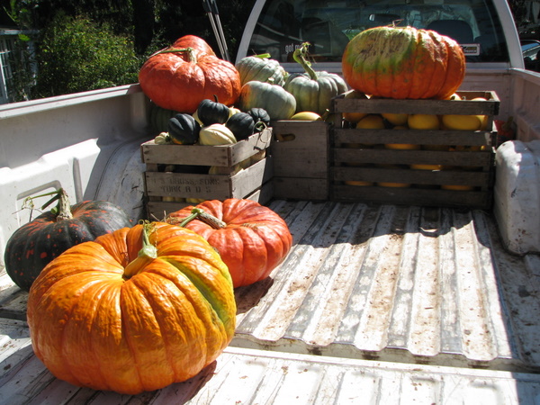 The bed of David Heisler’s truck being unloaded. His bumper sticker really should read “Got Pumpkin?”