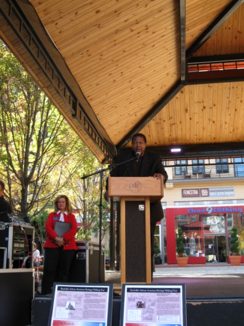Master of Ceremonies William “Billy G” Gordon introducing Mayor Susan Hoffman. Examples of the new plaques sit at the foot of the podium.
