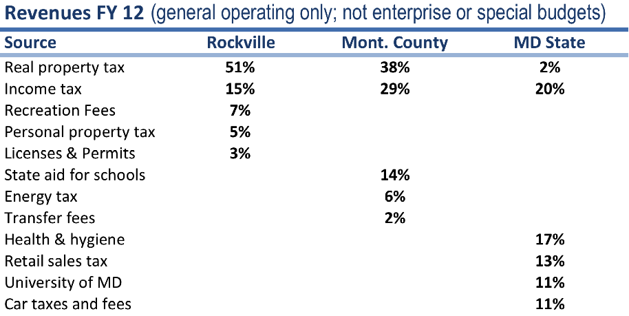 For the Council’s deliberations on the budget for fiscal year 2013, rather than look at ways to cut expenses, I urged them to consider new or expanded sources of revenue to maintain and enhance existing city services (particularly the parks and recreation, historic preservation, and public art programs) that make Rockville a distinctive place to live and work. Of course we need good roads, a responsive police department, regular trash pickup, and clean water–those are basics but they don’t make Rockville distinctive and prevent the monotony that’s so much the norm of suburban living. A comparison of the top five revenue sources among the city, county, and state suggests some opportunities (btw, the city budget presentation is a dreamcompared to the county and state).