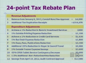 Observing the Mayor and Council discussion on the budget on May 7, 2012 suggests that Councilmembers Pierzchala, Moore, and Newton are taking a thoughtful approach, asking good questions, weighing successes and threats, and looking into the future as well as the current year. Councilmember Hall, on the other hand, seemed to have spent his time on a futile exercise to create a “24-Point Tax Rebate Plan” to cobble together $1.5 million for a $100 homeowner’s tax credit. It turned out that some of his numbers were wrong (e.g., he estimated the savings from the city manager vacancy would be $35000 but it’s actually closer to $10000), were pulled from capital projects (so couldn’t be used and additional funds would be needed), would run so close to the edge of our reserves that it would be impossible to continue for a second year, and that the Council had already voted on January 30 not to provide a homeowner’s credit. I really wish he would have spent his energies on tackling the capital improvements backlog, getting more support for community groups, or figuring out how to resolve the property tax revenue shortfalls, and not spending time at a Council meeting on a plan that wasn’t ready to be discussed.