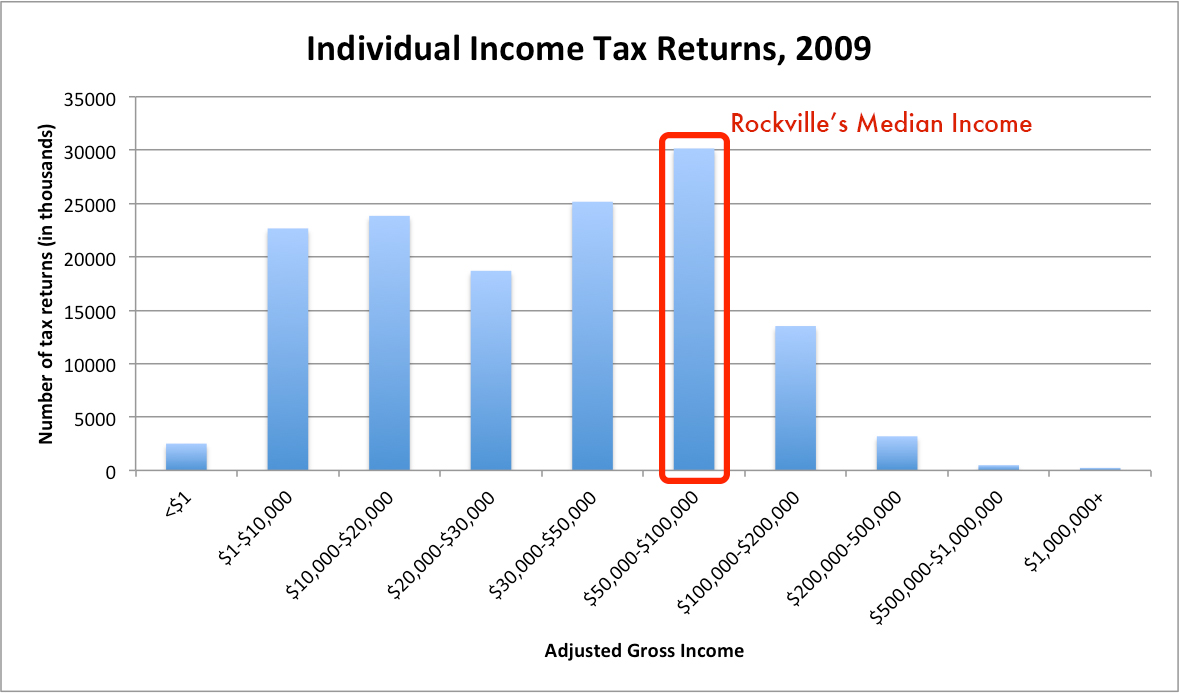 Individual income tax returns for 2009, showing where the median income for Rockville falls in red. Source: Internal Revenue Service and US Census Bureau.