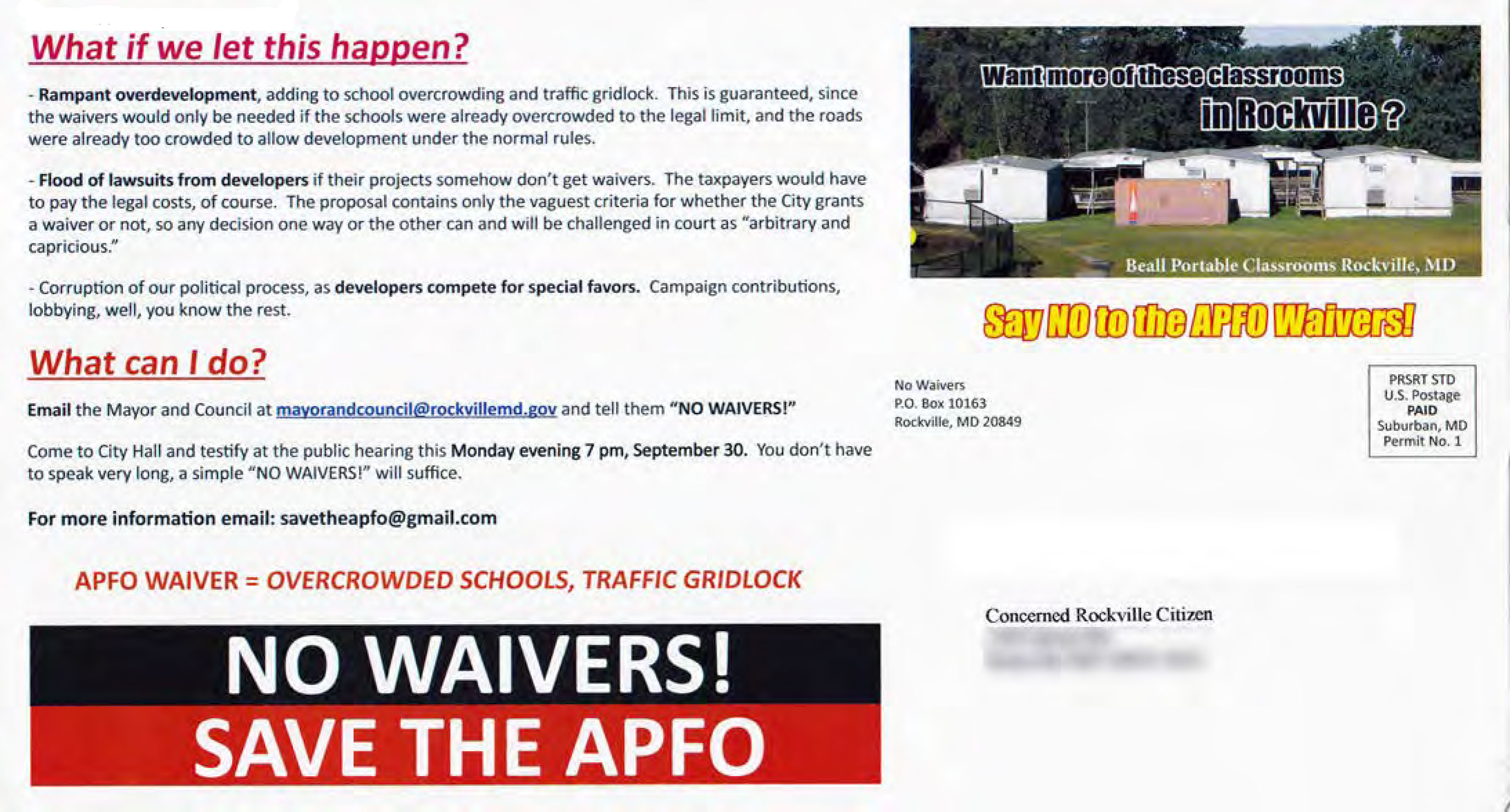 But this may not be an isolated event because the other side of the flyer focused exclusively on the Adequate Public Facilities Ordinance (APFO), a heated issue for specific constituencies in Rockville that was the subject of another similar effort. A month ago, an anonymous postcard focused exclusively on the APFO was mailed from a PO Box to specific neighborhoods in Rockville. It’s rumored that a few years ago another anonymous but similarly designed postcard was distributed about the proposed Bealls Grant II project. That suggests that the same people might be behind all these efforts and that they’ve formed a secret campaign committee that’s collecting and spending money to affect city decisions and elections. Again, that’s both unethical and illegal. According to our City’s election code, “every campaign committee…shall appoint and constantly maintain a chairperson and a treasurer, whose names and residences shall be filed with the City Clerk.” The threshold for creating a campaign committee is very low–it is, “any combination of two (2) or more persons appointed by a candidate, or candidates, or any other person or formed in any other manner which has as a principal purpose to assist or attempt to assist in any manner the promotion of the success or defeat of any candidate, candidates, principle or proposition.”