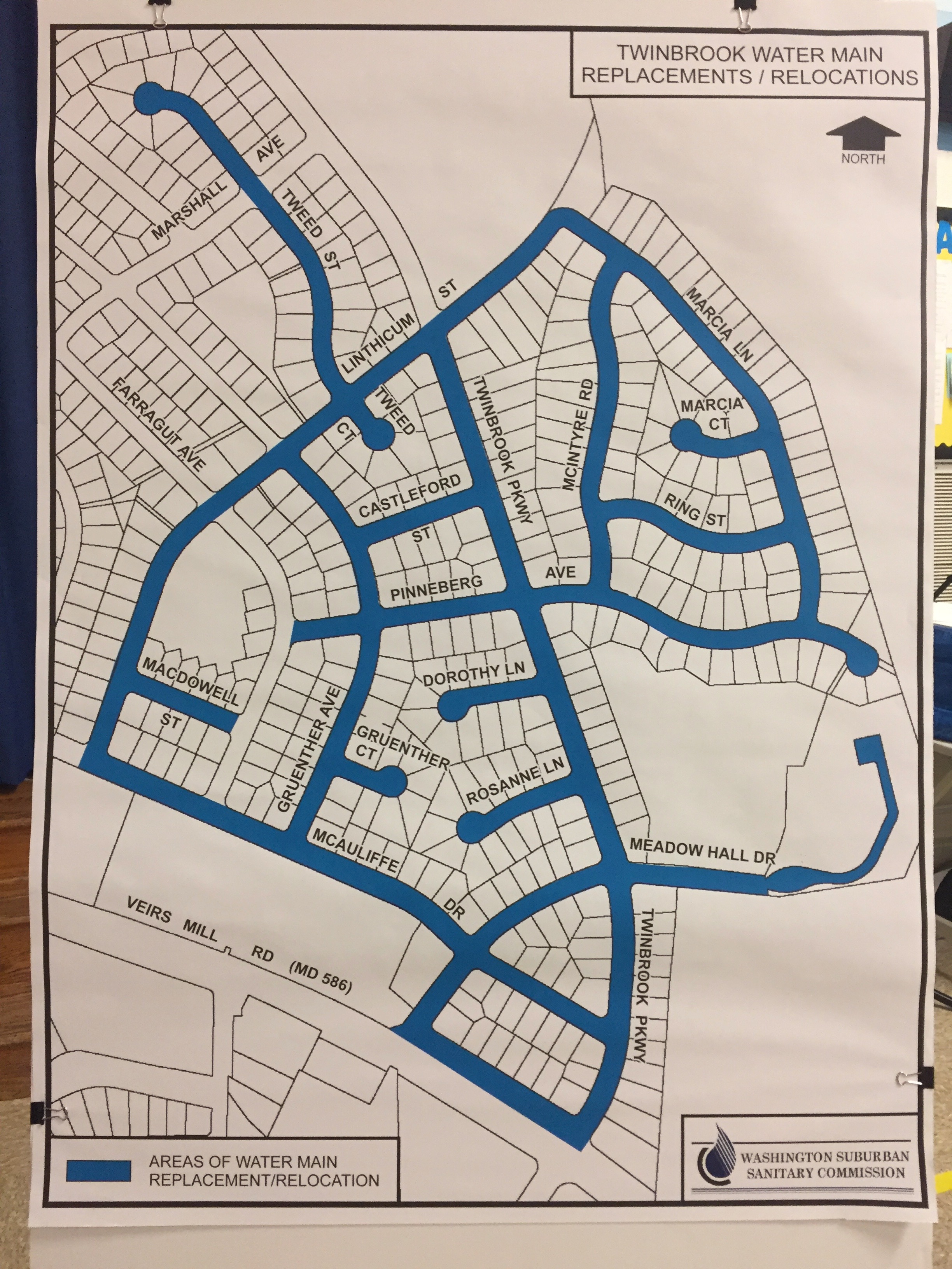 A dozen residents attended an information session on the replacement of water mains in the Twinbrook neighborhood of Rockville last night to learn more about the extent and impact of construction during the next two years. The Washington Suburban Sanitary Commission, one of the largest the water and sewer utilities in the nation, serves portions of Rockville and will be replacing the nearly 8 miles of water mains and installing 0.18 miles of new sewer lines in the area roughly bounded by McAullife, Linthicum, Marcia, and Meadow Hall with sections out Tweed Street and Twinbrook Parkway to Viers Mill Road (that’s 332 homes; see map below for details). The post-war neighborhood of Twinbrook is now passing the 50-year threshold, which means that the lifespan of the water system is coming to an end, a situation that’s affected other parts of Rockville as well.