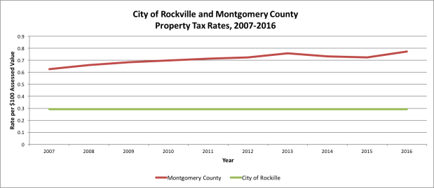 Secondly, the City of Rockville has held its property tax rates steady for the last decade, whereas the County continues to move upwards (see chart above). If you want to complain about property taxes, you need to take it up with the County Council, in particular Councilmember Sidney Katz, who represents Rockville. Most people rarely contact the County Council, indeed, the latest tax increase adopted in April didn’t attract any comments from residents, even though it exceeded the Constant Yield Tax Rate. I’m not sure why this happened but it could be the lack of adequate public notice (no newspapers in Rockville) or that County government is much more complex than the city, its bureaucracy is far more Byzantine, their meetings and public hearings are held during the daytime (when most people are working), and residents rarely encounter County Councilmembers to share their concerns (although I’m sure they feel they’re always out in the community).