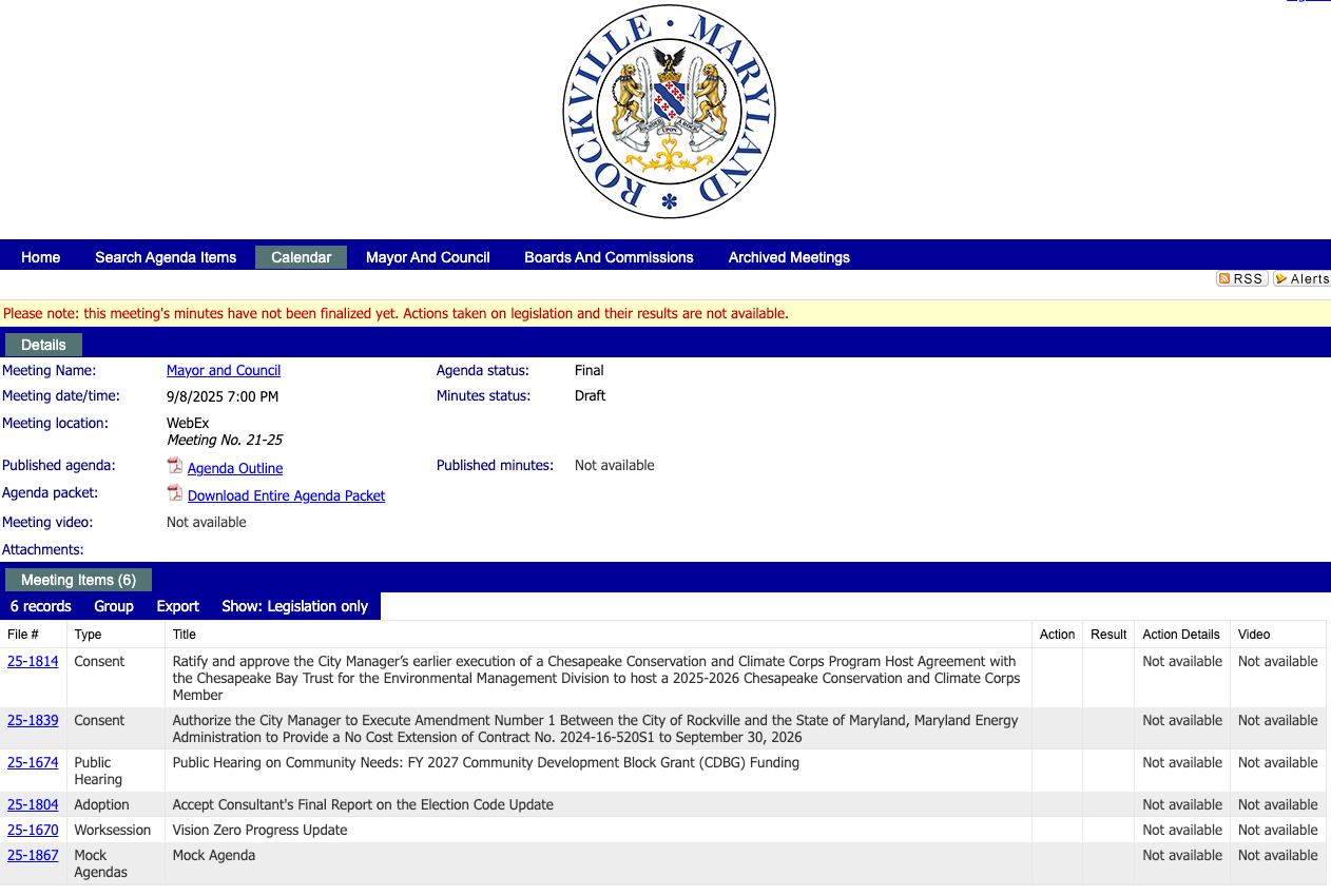 Rockville is now using a new web-based platform that should make public meetings easier to find and navigate. Available at rockvillemd.legistar.com, the site provides an agenda outline, a full agenda packet in PDF, links to individual items, and video recordings of meetings. Users can also search agendas by keyword to quickly find related items.