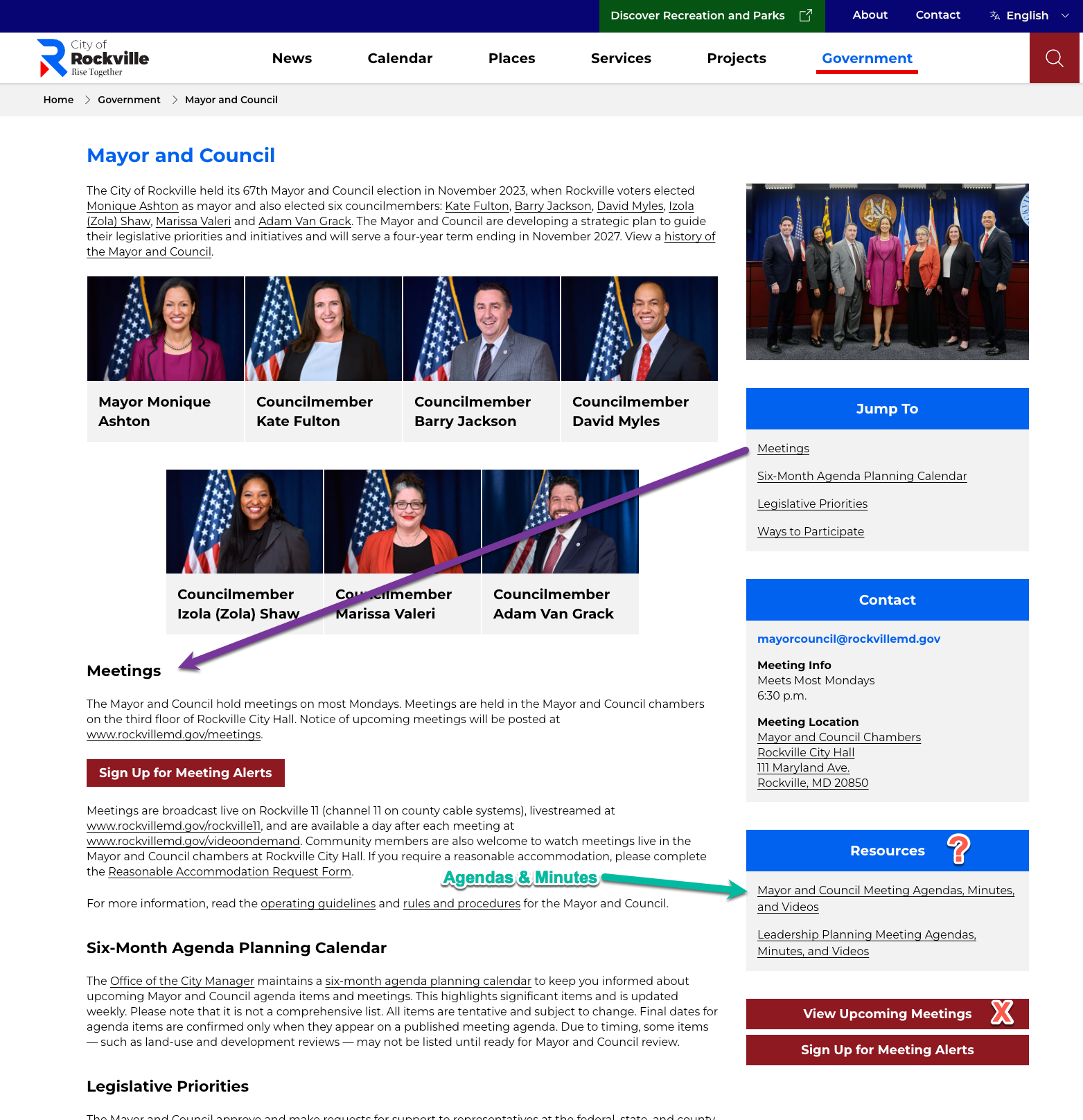 If you go to the main Mayor and Council page, you’d expect a clear link to meeting agendas, minutes, and videos—the core of local democracy. Instead, clicking “Meetings” simply scrolls you down the same page to a paragraph explaining that the Mayor and Council usually meet on Mondays in City Hall. That’s useful background, but it doesn’t help residents find out what their elected officials are actually discussing or deciding.