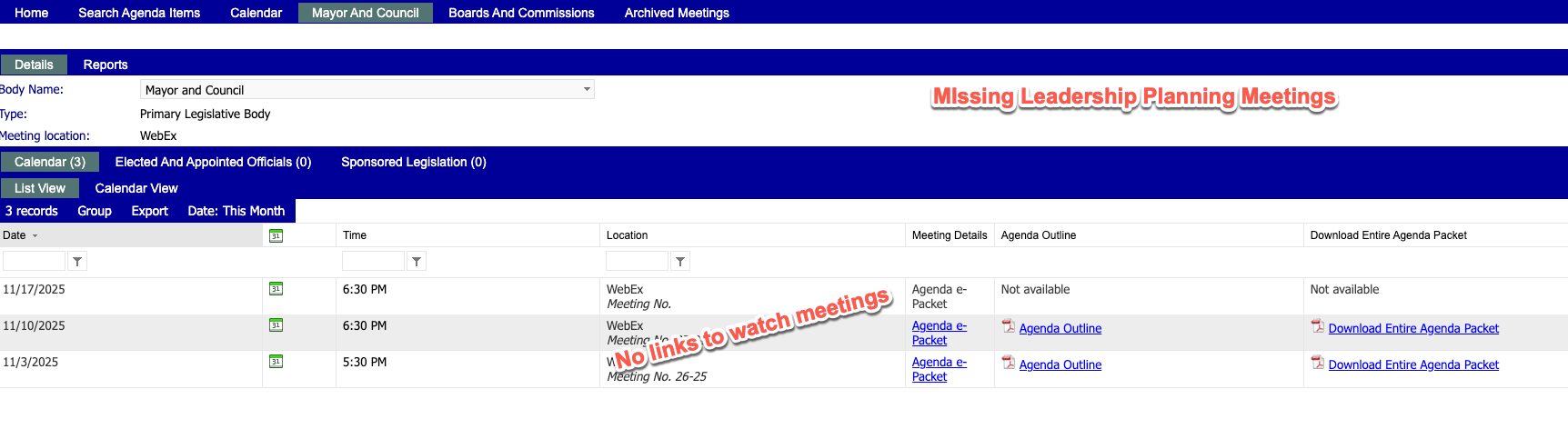 Adding to the confusion, the “View Upcoming Meetings” box doesn’t work as intended—it omits the Mayor and Council meetings entirely. Instead, it’s the “Mayor and Council Meeting Agendas” link that takes you to a list of upcoming sessions, but it lacks clickable links to watch the meetings online. Meanwhile, the Leadership Planning Meetings—which are important working sessions of the Mayor and Council for long-term priorities—aren’t listed in their calendar at all. Instead, they are treated like boards and commissions, when they are actually a type of Mayor and Council meeting.