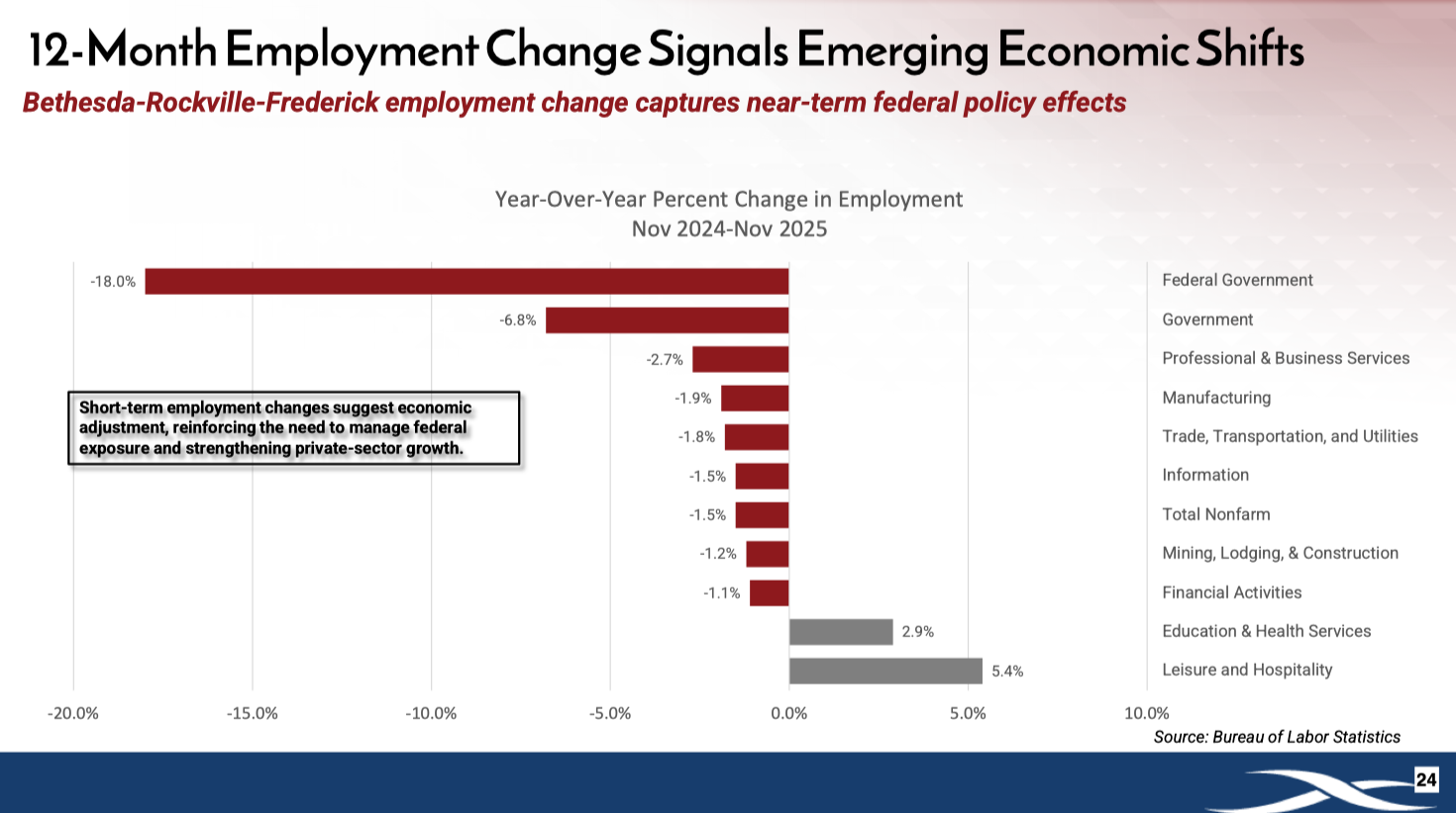 The Rockville Mayor and Council met on February 9, 2026, when Rockville Economic Development, Inc. (REDI) presented a major economic briefing about how federal policy changes are affecting the city. The full reports — including the Economic Impact presentation and supporting materials — are available in the Council agenda packet posted on the city website. Together they paint a clear picture: Rockville’s economy is stable today, but entering a period of structural transition.