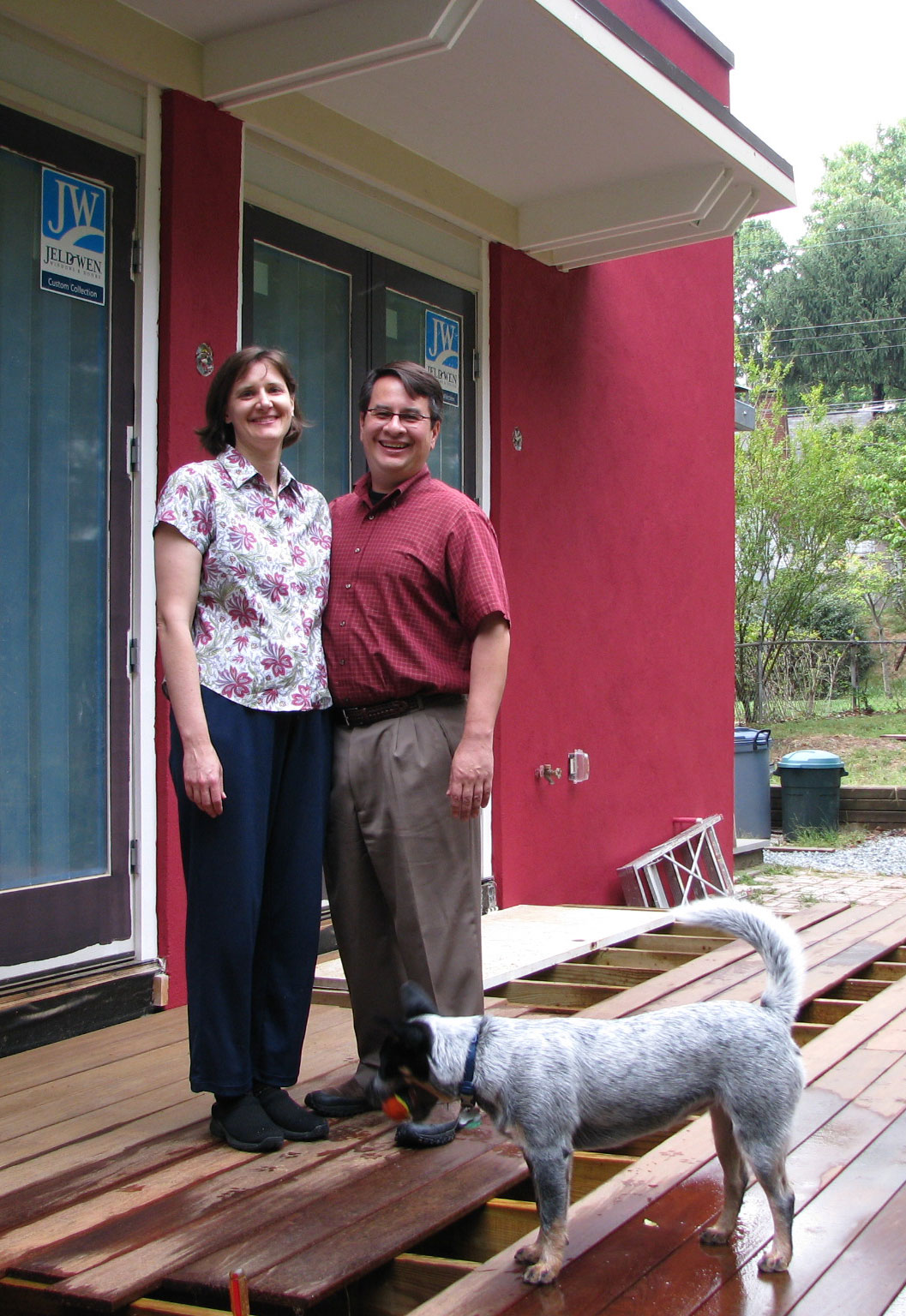 Mary (my wife) and Addie (our dog) on our deck during construction of a room addition.
