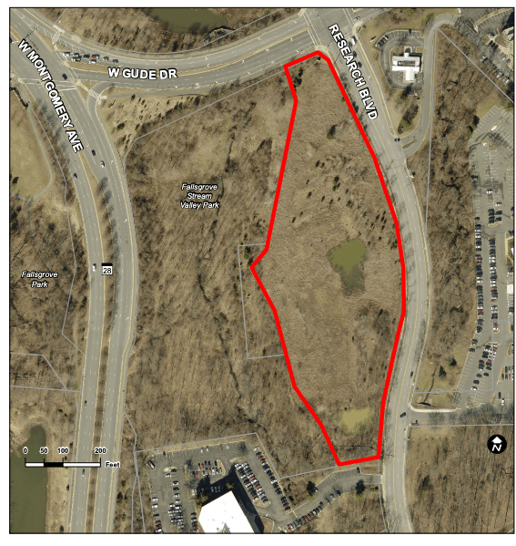 Key West Center Fallsgrove LLC is requesting permission to building up to 350 multifamily units on an undeveloped property at 1800 Research Boulevard. It is currently zoned for research-and-development offices, but they are requesting a change to residential use, exceed the number of apartments allowed in Fallsgrove, and exceed the building height restrictions. In addition, they are asking to retain the ability to construct an office, if market conditions change (“having their cake and icing, too”). The property is within the Richard Montgomery Cluster Area. According to a 2019 traffic study, the project will “not substantially alter or change the projected and approved vehicular traffic flow movements in and around the subject site.” The Planning Commission had twice approved projects for eight-story office buildings, but nothing was built.