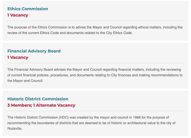 Rockville’s website shows 26 vacancies on its boards and commissions in July 2019 (this is just an excerpt).