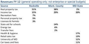 For the Council’s deliberations on the budget for fiscal year 2013, rather than look at ways to cut expenses, I urged them to consider new or expanded sources of revenue to maintain and enhance existing city services (particularly the parks and recreation, historic preservation, and public art programs) that make Rockville a distinctive place to live and work. Of course we need good roads, a responsive police department, regular trash pickup, and clean water–those are basics but they don’t make Rockville distinctive and prevent the monotony that’s so much the norm of suburban living. A comparison of the top five revenue sources among the city, county, and state suggests Continue reading →