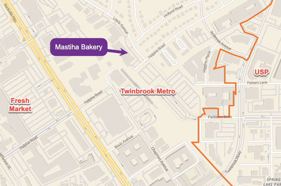 Mastiha is near the Twinbrook Metro and a bit off the beaten path, although close to the Twinbrook neighborhood, at 2387 Lewis Avenue (the mini-industrial area adjacent to the railroad tracks). To reach it from Twinbrook Parkway, you’ll need to take Ardennes Avenue to Halpine Road (see map below). They are open on Thursday to Saturday from 9:00 am to 4:00 pm with limited items will be available for walk-in purchase while they last.