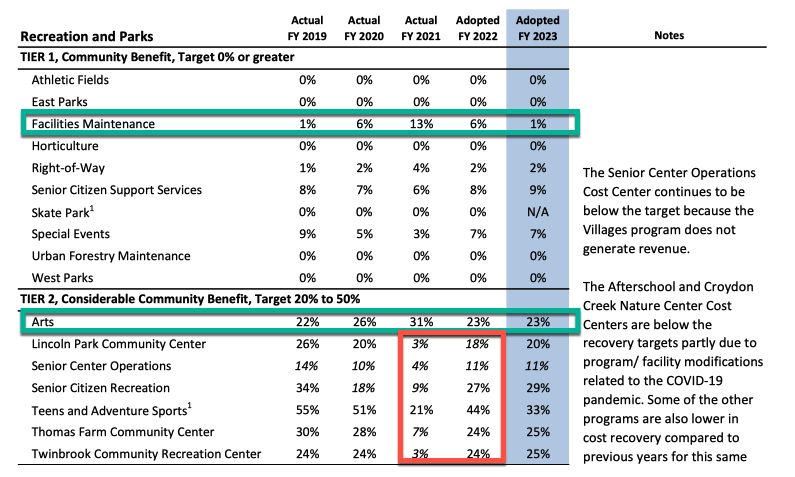 The City of Rockville has an extensive set of financial management policies that affect eight major areas: achieving and maintaining a structurally balanced budget, fund balance and reserve policies, capital planning policies, investment policies for both retirement plans and City funds, revenue control and management policies, economic development policies, and debt compliance and data analysis policies. For Recreation and Parks programs, the City uses a “five-tier cost-recovery pyramid” ranging from Tier 1 for parks, trails, landscapes, playgrounds, and general-use facilities with a 0% cost recovery to a Tier 5 for private rentals and private lessons with a 100% or more cost recovery. Fees and charges are reviewed and adjusted annually, but the pandemic lowered cost recovery significantly. In Tier 2, for example, the Lincoln Park Community Center is expected to recover 20% of its costs in 2022 (a subsidy of 80%) but in 2021 it actually recovered 3% (a subsidy of 97%). There are a couple of bright spots: Facilities Maintenance and Arts recovered more than expected (in other words, required less of a subsidy), most likely as well due to the reduced use of facilities and arts programs during the pandemic. A summary is available on Packet Page 34.