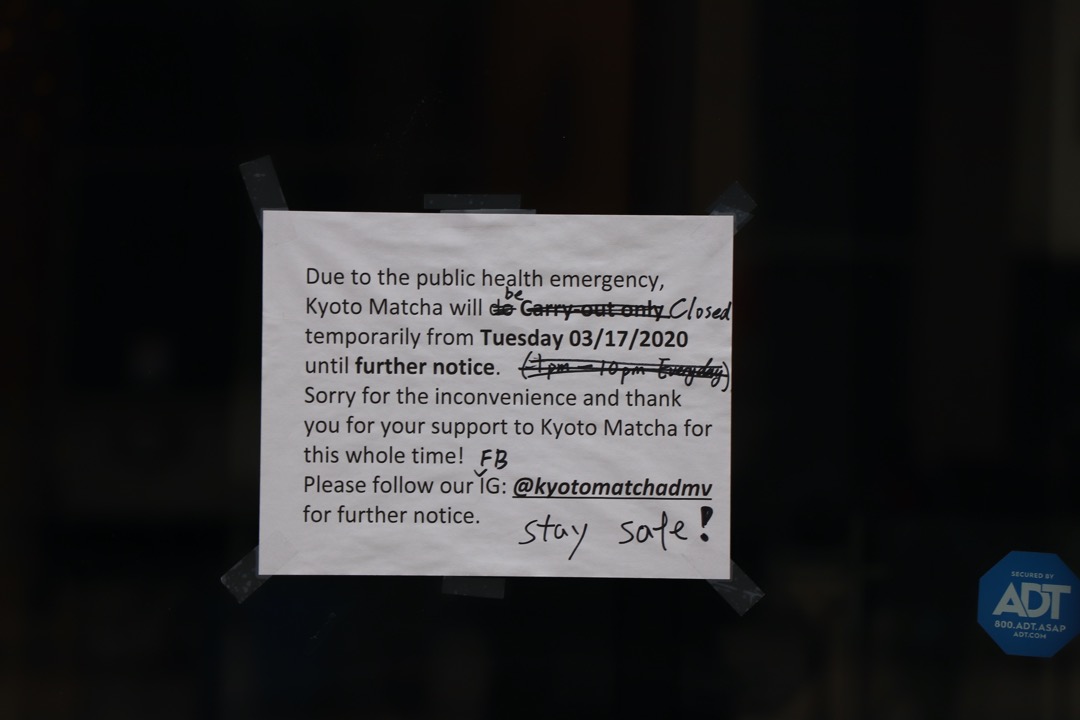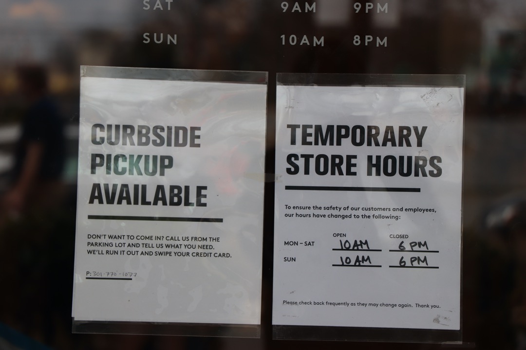 With the increasing restrictions on restaurants and social gatherings, Rockville is slowly feels like a ghost town, or that we’re in the midst of a snowstorm without any snow. To document the effects of COVID-19 on the community, I randomly photographed shopping centers from downtown south on Rockville Pike. A few stores and restaurants were open (such as Fresh Market or Buy Buy Baby), but most were closed or had limited access or hours. Many had signs in the windows explaining they had temporarily closed or that they had switched to pick-up only, but a few just locked the doors and turned off the lights. On an otherwise busy Saturday afternoon, the parking lots were nearly empty. I have a terrible feeling that if this closing continues on for another week or two, it will have a devastating impact on many small businesses, which will have a cascading impact on the city.