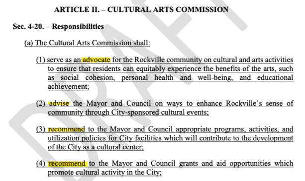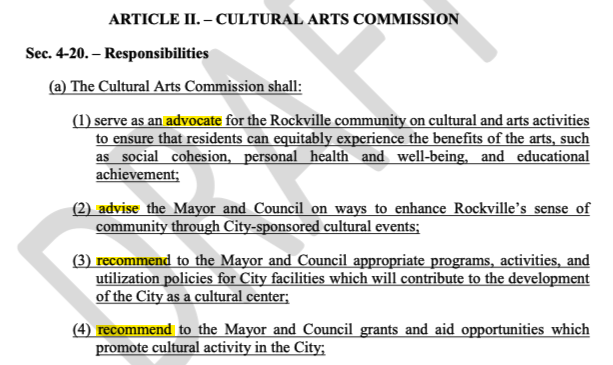 The Mayor and Council is considering revised responsibilities for the Cultural Arts Commission with troubling consequences for citizen involvement. This change is happening at the behest of the Cultural Arts Commission to promote “inclusivity and cultural richness” but they may not have noticed that the revised responsibilities also disempowers them. As proposed, the Commission will no longer review the budget for the Civic Center (where performing and visual arts are primarily presented in Rockville) nor review the design of all new City-owned cultural facilities. Instead, their primary responsibilities are to advise and make recommendations to the Mayor and Council, not encourage, assist, foster, or work. How often will the Mayor and Council ask for their advice or recommendations? The Commission is becoming more passive, less active. More details starting on page 135.