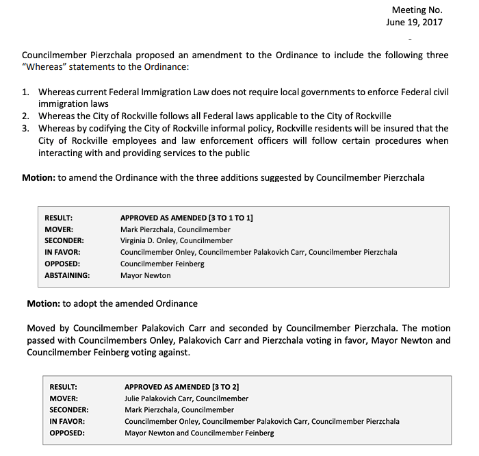 The debates on Rockville’s Mayor and Council reveal these generational differences as well, although they’re not always on generational lines. In June 2017, on a split vote, they adopted the Fostering Community Trust Act, which prohibits city staff (including police officers) from arresting or discriminating against any person on the basis of citizenship or requesting a person’s immigration status when providing city services. It was supported by Councilmembers Onley, Palakovich Carr, and Pierzchala, opposed by Mayor Newton and Councilmember Feinberg and . The differences are stark: one side aligns with the older generation, the other side thinks younger, and led by a mayor that’s unsure where to go. In the meeting, not only did Feinberg vote against the ordinance, she attempted to weaken the City’s position by making it a policy posted on the city website, rather than an ordinance published in the city code. Newton waffled and revealed her indecisiveness by abstaining from the vote on the amendments that clarified federal and city roles in law enforcement (how is it possible for someone to abstain on this topic?).