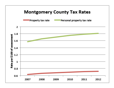 I often hear Rockville residents grumble about property taxes and they often blame the city for taking an unfair share of their hard-earned income. Although property taxes in the City of Rockville have held steady for the last few years, they’ve risen in Montgomery County. From 2007 to 2012, the County Council has increased the tax rate each year–but hardly anyone in Rockville has noticed and put the blame in the right place. In 2007, the property tax rate was 62 cents for every $100 in assessed value, today it’s 72 cents–a 15 percent increase over five years. Businesses were similarly affected through personal property taxes (which is assessed on inventory, manufacturing equipment, etc.), rising from $1.57 to $1.81, a 16 percent increase over five years. No changes at the State of Maryland–it does not assess property taxes.