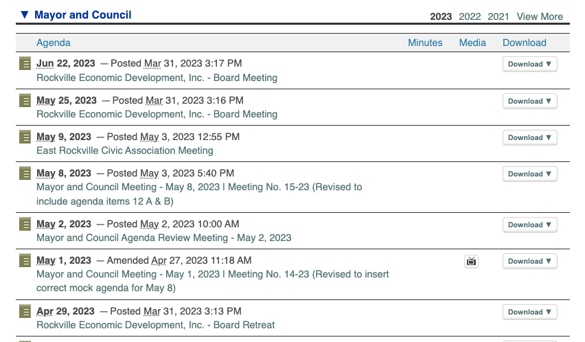 The confusion is caused by treating all meetings the same, when they’re not. Residents and businesses want to attend the meetings that have the most impact on them, which are the Mayor and Council meetings. While a councilmember may attend the East Rockville Civic Association or the Rockville Economic Development board meeting, the City Council is not making decisions about taxes or ordinances at those events. The next step is keep the audience in mind–who uses the Agenda Center? Who is it for primarily? Secondly, distinguish the meetings to highlight the meetings that are most important for the audience. Hire a good graphic designer to figure this out. Otherwise, it’s going to cause residents and business to be even more frustrated in their efforts to learn what their elected officials are doing (have you noticed that minutes aren’t available for about six weeks, which means you have to rewatch the entire council meeting for the latest news).