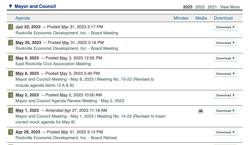 The confusion is caused by treating all meetings the same, when they’re not. Residents and businesses want to attend the meetings that have the most impact on them, which are the Mayor and Council meetings. While a councilmember may attend the East Rockville Civic Association or the Rockville Economic Development board meeting, the City Council is not making decisions about taxes or ordinances at those events. The next step is keep the audience in mind–who uses the Agenda Center? Who is it for primarily? Secondly, distinguish the meetings to highlight the meetings that are most important for the audience. Hire a good graphic designer to figure this out. Otherwise, it’s going to cause residents and business to be even more frustrated in their efforts to learn what their elected officials are doing (have you noticed that minutes aren’t available for about six weeks, which means you have to rewatch the entire council meeting for the latest news).