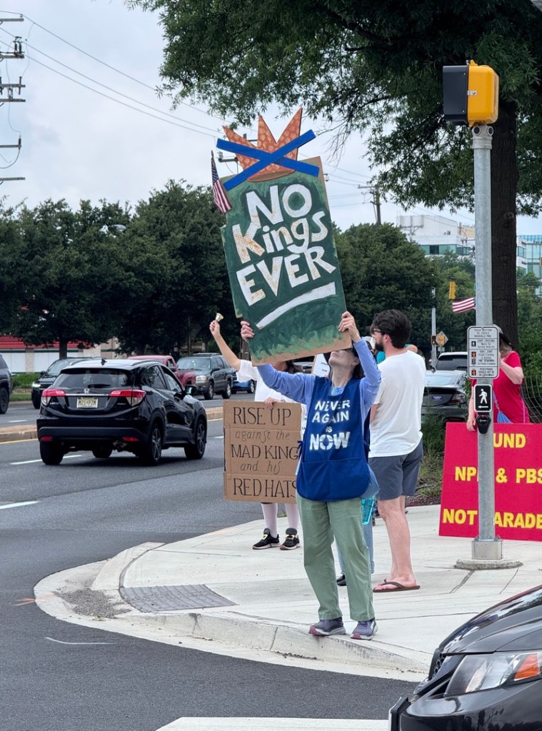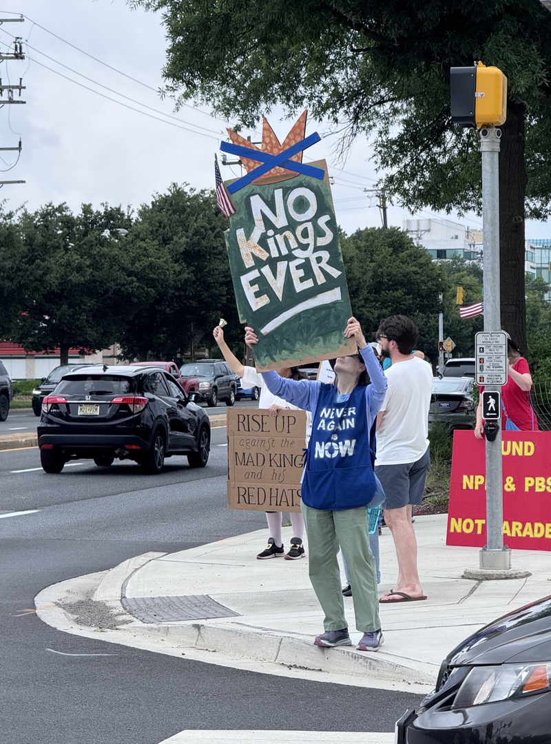 Today thousands of residents lined Rockville Pike from north to south in a spirited “No Kings” protest, drawing attention to growing concerns about government overreach. The demonstration, marked by homemade signs, upside down crowns, American flags, and spontaneous cheers, brought together neighbors, friends, and families united by a shared sense that President Trump is exceeding his authority.