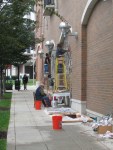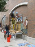 For a change of pace from the election, have you noticed that Judith Inglese is installing a wonderful ceramic mural depicting the history of Rockville on the wall facing Washington Street in the Town Square? Her handcut and glazed tiles fit together as a puzzle (not just squares of painted tile) and includes bas relief elements. When you see it, it may remind you of the cafeteria mural at Twinbrook Elementary School (1987), two murals at Luxmanor Elementary School (1989), and the entry plinth at the Senior Center (1998)–those are her works as well. She is currently in the midst of installing the second of three murals and she was happy to chat when I stopped by (but she’s on a schedule and working with grout, so don’t talk too long!). When she’s finished, you’re not only going to enjoy seeing it, but touching it as well. What a marvelous addition to our city’s public art collection!