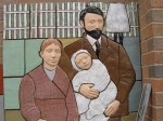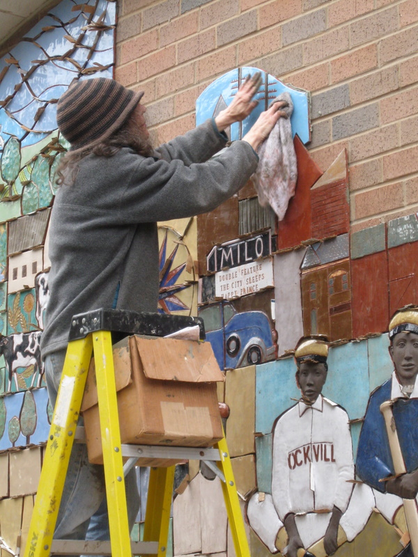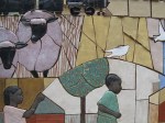 - Tile mural detail in Town Square, ungrouted with cardboard spacers.