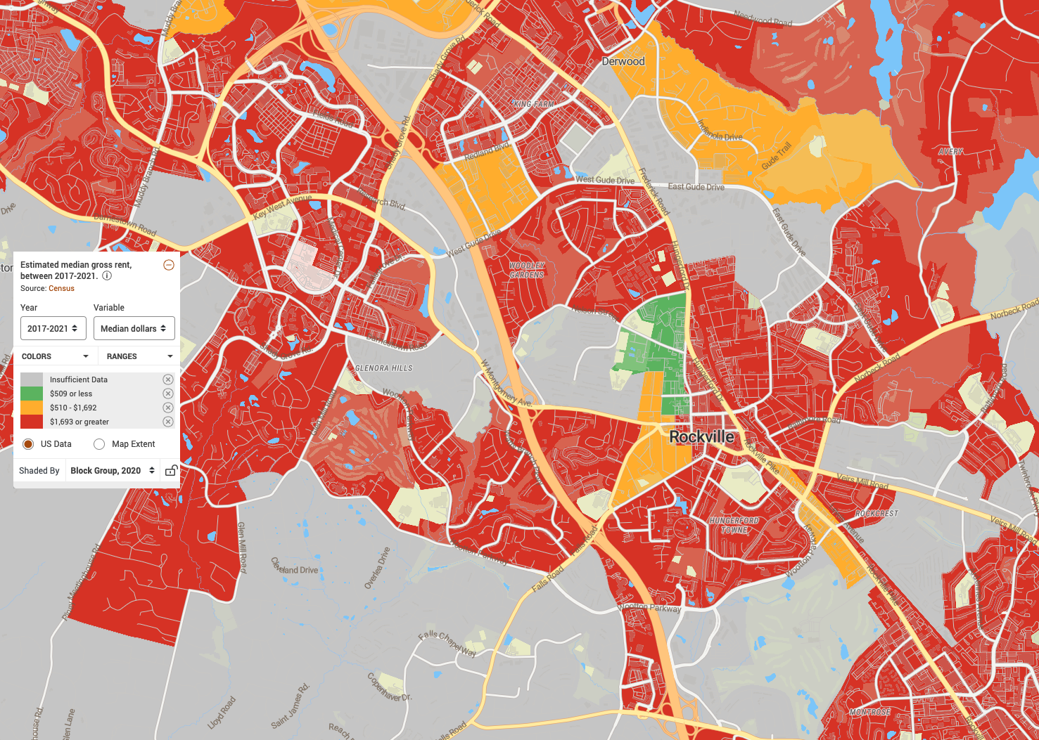 So, what rent can you afford when your monthly income is $1,693? According to HUD, a household is considered burdened when they spend more than 30% of their income on housing and severely burdened when they spend more than 50% of their income on housing. Ideally, an individual in this case would want to spend no more than $510 per month on housing for it to be considered affordable. As you can see in the map for Rockville, finding a place at a reasonable level of rent is highly unlikely (green is less than $510; orange or red exceeds $510 per month or 30% of the average Social Security monthly payment). The only neighborhoods that are affordable are College Square, Cambridge, and Heritage Park (in green; in addition there are several apartment buildings throughout the city that offer a limited number of affordable units).