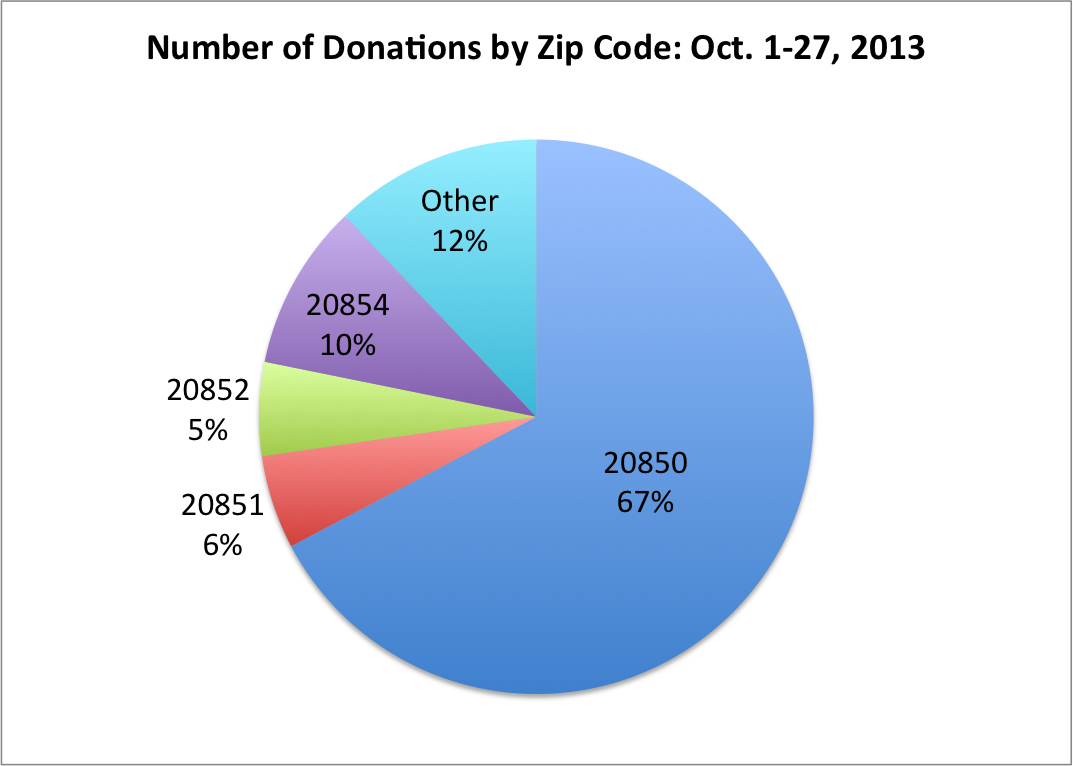 The second campaign finance reports for the Rockville Mayor and Council elections for the period October 1-27, 2013 were recently submitted and they reveal that Zip Code 20850 (includes Fallsgrove, West End, New Mark Commons, East Rockville, Lincoln Park, College Gardens, King Farm) still dominates the contributions and even increased their giving by 5 percent compared to September. The other Rockville Zip Codes fell far in the distance at 10 percent for 20854 (Horizon Hill, Fallsmead, Potomac Woods); 6 percent for 20851 (Twinbrook); and 5 percent for 20852 (Hungerford, Montrose, North Farm). For the entire election season, 20850 is tops at 63 percent, contributions outside the city come in at 21 percent, and the other three Zips stand at about 5 percent. Again, that roughly mimics the voting records for those regions and perhaps how much they Continue reading →