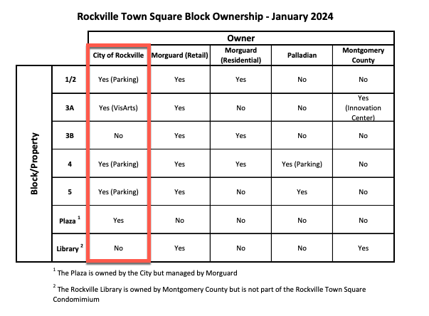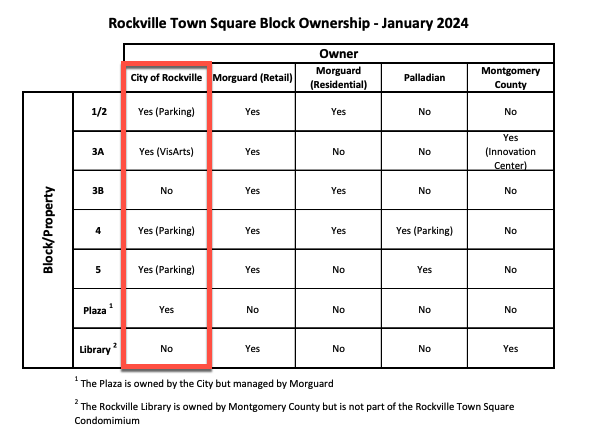 Square Condominium Board, replacing Deputy Director of Public Works James Woods. The staff report provides some insight into the complex ownership and management of Town Square, explaining that it “consists of five blocks, each of which has a condominium association represented by the respective owners of each block. These owners must delegate a representative to the Rockville Town Square Master Condominium Board. The City owns portions of Block 1/2, Block 3A, Block 4 and Block 5. The City’s ownership of Block 1/2, Block 4 and Block 5 is limited to the Parking Garages. The City’s Block 3A ownership includes the Arts and Innovation Center where VisArts is located. Each block’s condominium association has an agreement delegating the management of common areas to Morguard. Several other agreements were established to delegate the management of the Plaza, the private sidewalks, and the Parking Garages to Morguard.” (page 101+)