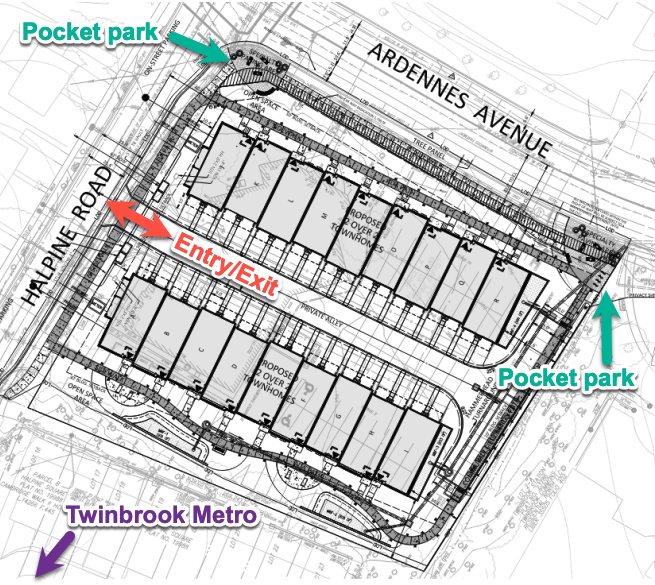 The City Council will receive a briefing on a request from Pulte Home Company to rezone a property at 5906 Halpine Road (Twinbrook) from R-60 (single unit detached residence) to RF-FZ (residential flexible-floating zone) to permit construction of 36 two-over-two stacked condominiums (page 104+). The “two-over-two stacked” dwelling type consists of 2 two-story townhouses which are stacked one on top of the other to create a four-story building. For comparison, the adjacent Cambridge Walk has 17 townhouses. At a community meeting on May 16, 2023, attendees voiced concerns about protecting of the existing adjacent forest conservation area as well as adequate visitor parking on site. Pulte will brief the Council about the proposal, including a project overview and review schedule and at a future meeting, the Mayor and Council will hold a public hearing and consider rezoning the property, approving the Project Plan, and authorizing waivers to the required side yard setback and layback slope for the project.