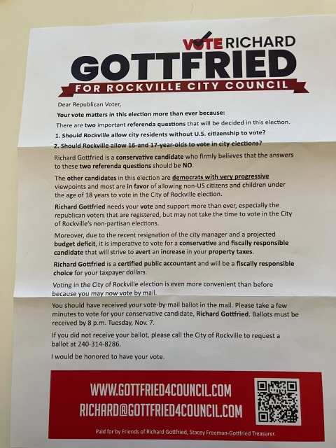 It’s fine that candidates tailor their messages for their audiences, even along party lines in a non-partisan election (although it is really stretching the bounds of traditional campaigning in Rockville). But if you care about a candidate’s values and how they will conduct themselves in office, these letters will be eye-openers. Democrats will be incensed that he’s campaigning in this manner. But Republicans will be as well, because in the 2019 election, Richard Gottfried was registered as a Democrat. I’m not sure if this makes him a DINO (Democrat in Name Only) or a RINO (Republican INcognitO).