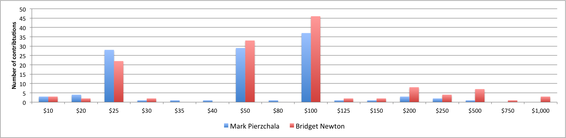 I continue to delve into the financial support for the mayoral race to determine how it reveals the sentiment of the community (and perhaps the outcome of the election tomorrow). Voters who contribute to campaigns are typically “true believers,” especially as the amount increases, and often actively campaign for their candidates and are rarely dissuaded by any contrary information or facts. Newton has many of them as can be seen in the chart above, but will it be enough?
